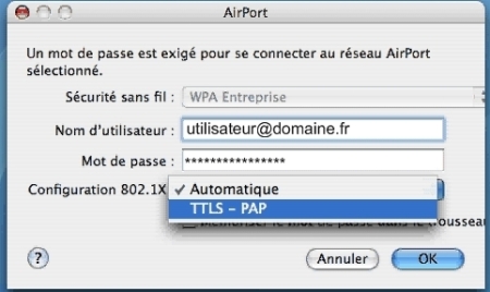 - Choisissez TTLS-PAP dans la liste déroulante "configuration 802.1x" et validez.