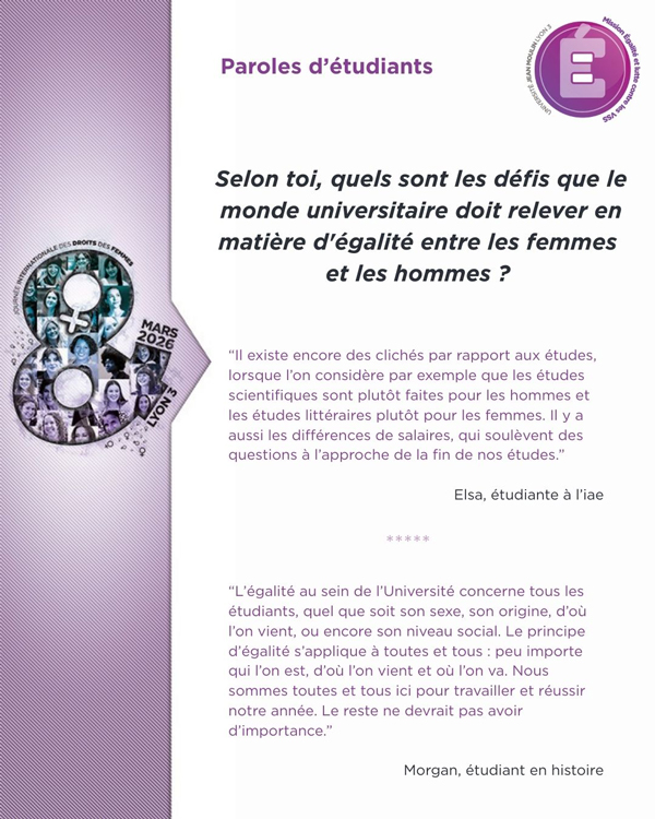 À l'occasion de la Journée internationale des droits des femmes du 8 mars, l'Université Jean Moulin Lyon 3 se mobilise pour la promotion de l'égalité, à travers une série d'événements et d'initiatives portés au sein de notre établissement.