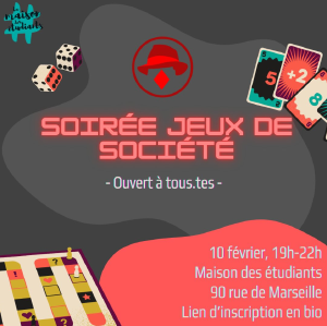Rendez-vous pour une soirée jeux ! Une diversité de jeux est proposée (gestion, bluff, cartes, ...) tels que les Aventuriers du Rail, 7 Wonders Catan, Skyjo, Kosmopolit, Papayoo, Kluster, Résistance, Jamaïca, Mémoire 44, Root, etc.