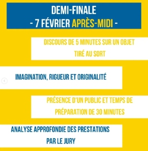 Venez assister à la demi-finale d'Imp(r)ose-Ton-Éloquence ! 8 orateurs sélectionnés le matin même passeront devant un jury sur des sujets des plus spéciaux, dans l'espoir de se qualifier pour la grande finale improvisée du 26/02 à 18h. Pour cette épreuve, les sélectionnés n'auront que 30 minutes pour préparer leur discours, le soutien du public leur sera essentiel ! La demi-finale se tiendra au sein de l'Amphithéâtre Huvelin.