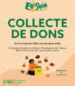 L'association L3DD organise avec Episcia, son épicerie sociale et solidaire, une collecte de dons de vêtements et d'accessoires propres et en bon état en vue d'une redistribution aux étudiants. La collecte a lieu tous les après-midis du 5 au 9 janvier à Episcia.