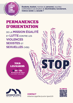 La Mission Égalité et lutte contre les VSS de l'Université Jean Moulin Lyon 3 propose, depuis le mois de mars 2025, des permanences d'orientation contre les discriminations et les VSS (violences sexistes et sexuelles) destinées à tous les étudiantes et étudiants ainsi qu'à tous les membres du personnels.